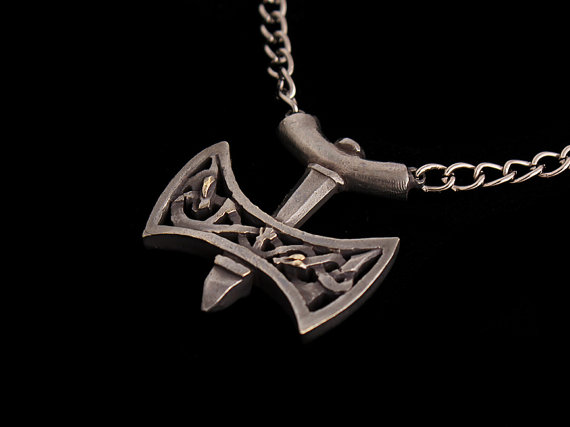 Norra mütoloogia äikesejumala Thori sümboliks olev Mjölniri haamri omaloominguline võitlevate lohede põimikmustriga versioon.